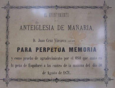 Son ya casi de 140 años cuando en los montes de Urkiola y en la zona denominada como Eskillar de la Peña Eskubaratz más abajo de Kanpatorrosteta, el morroi (criado) de la familia Bizkarra del caserío Askondo, logró abatir junto con otros dos vecinos y con una escopeta de avancarga, un magnífico oso pardo que días atrás les había matado varias ovejas. Juan Aguirre (q.e.p.d.) del caserío Barrenengo, del precioso valle de Urkuletas corazón de esta ubérrima cordillera de porte majestuoso, nos contó allá por el año 1995, como estos tres jóvenes baserritarras una noche de invierno hicieron un aguardo al oso en lo alto de la montaña. La fortuna quiso que al retirarse el oso al amanecer tropezase con una cabra a la que mató al instante. Sus chillidos alertaron a los cazadores que de un certero disparo hicieron rodar peñas abajo al último oso pardo de Vizcaya. Eran otros tiempos, y nada se les puede achacar a estos intrépidos cazadores / ganaderos que en definitiva defendían sus intereses de la única forma que podían hacerlo. Conviene recalcar para aclarar esta ultima afirmación, que en aquel agosto de 1871 el ayuntamiento de la anteiglesia de Mañaria concedió un diploma EN PERPETUA MEMORIA al ganadero que abatió el ultimo oso de Bizkaia.