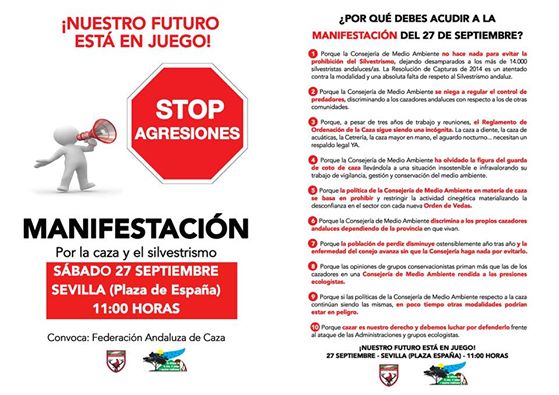 A final de mes esta la ineludible cita con la manifestación que ha organizado la FAC en Sevilla el 27-9-14. Donde los silvestristas harán oír sus voz, frente a las decisiones injusticias con las que que el Gobierno de Andalucía y la CE están ahogando esta practica cinegética.